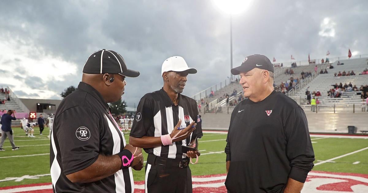 Pictured while talking with officials before the start of an October home game, Bill Blankenship has a five-season Owasso record of 52-10 and two state championships.