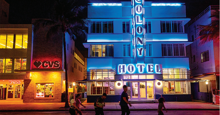 People walk past the Colony Hotel while going down Ocean Drive after curfew in Miami Beach on March 27, 2021.