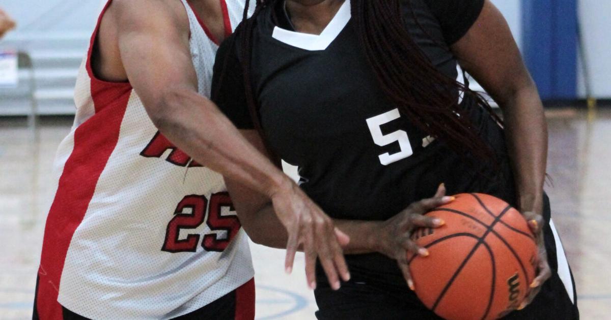 Darlene Beale-Norris, 56, right, battles to the hoop against Delia Fulmere, 59, of the Broward Heat.